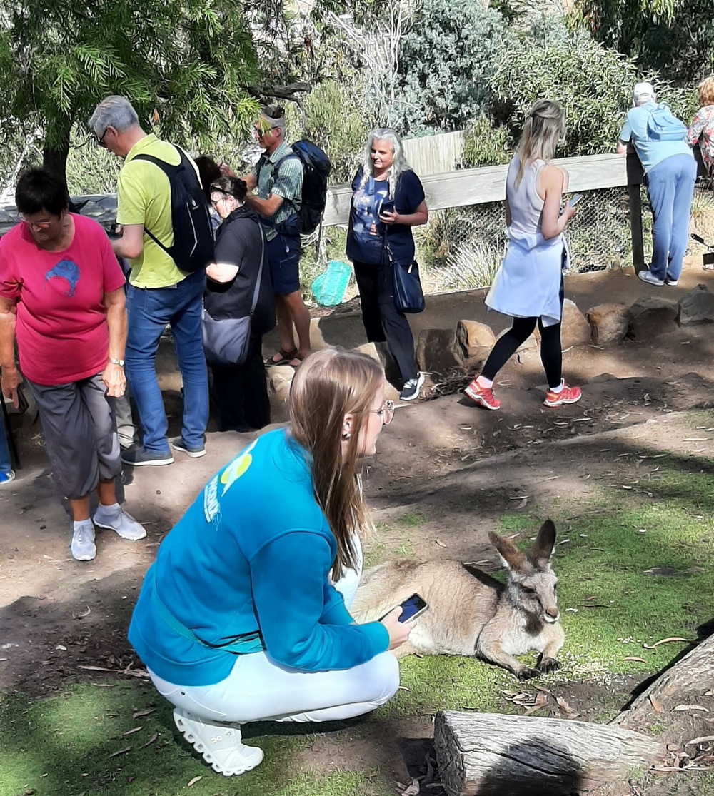 Gleichzeitig mit uns kam am Bonorong Wildlife Sanctuary ein Bus mit 50 Phoenix-Ausflüglern an. Die Ausflügler wurden als Gruppe am Kassenhäuschen vorbeigeschleust, während wir dort anstanden, um unsere Eintrittskarten zu kaufen (34,50 NZD – 20,00 €). Die Phoenix-Reiseleitung musste aber den ein oder anderen Ausflügler wieder einfangen, der sich brav hinter uns eingereiht hatte.