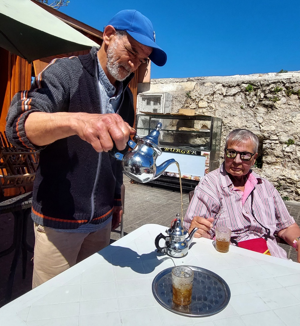 Vor zwei Jahren machten wir hier in Tanger an einer Bude, mit einigen Tischen davor, Rast und tranken den für Nordafrika typischen Pfefferminztee mit aufgebrühten frischen Pfefferminzblättern. Der Tee war vorzüglich und der Budenbesitzer urig und nett. (Siehe Reiseblog 2022/023 Eintrag 3.4.2023).