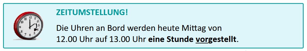 Heute mussten wir um 12 Uhr mittags die Uhren um eine Stunde vorstellen, also wurde es schlagartig 13:00 Uhr.