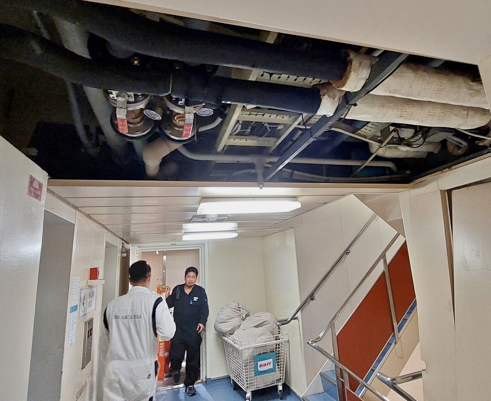Ein kurzer Anruf an der Rezeption bewirkte, dass 2 Techniker im Marsch gesetzt wurden. Das Problem lag aber nicht irgendwo in unserer Kabine, sondern außerhalb an irgendeinem Verteilerstrang hinter einer Decke.