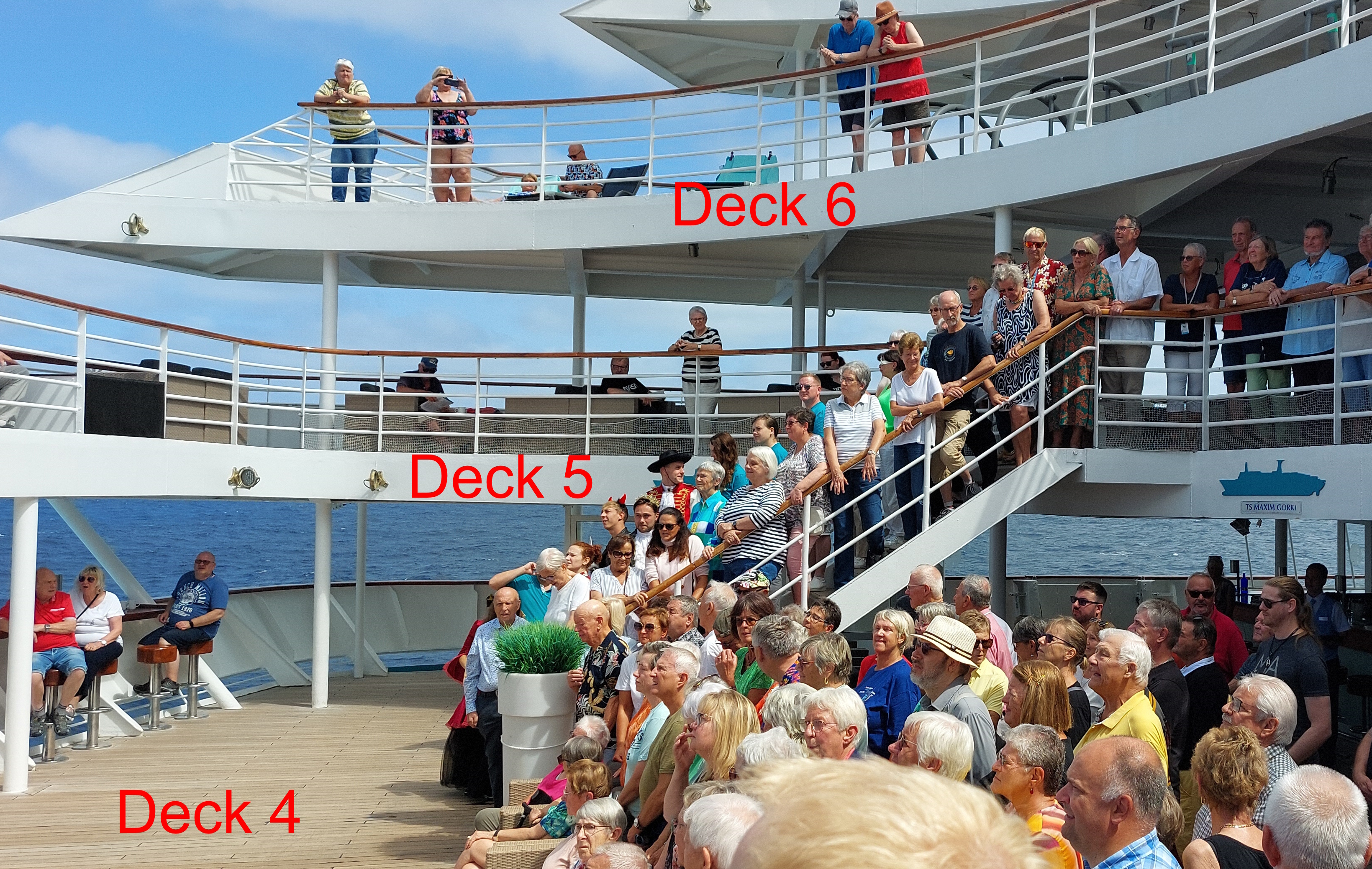 Auf Deck 5 und 4 waren nur noch Plätze in den hinteren Reihen frei, gemäß dem Motto: "Die Großen nach vorn, die Kleinen nach hinten."
