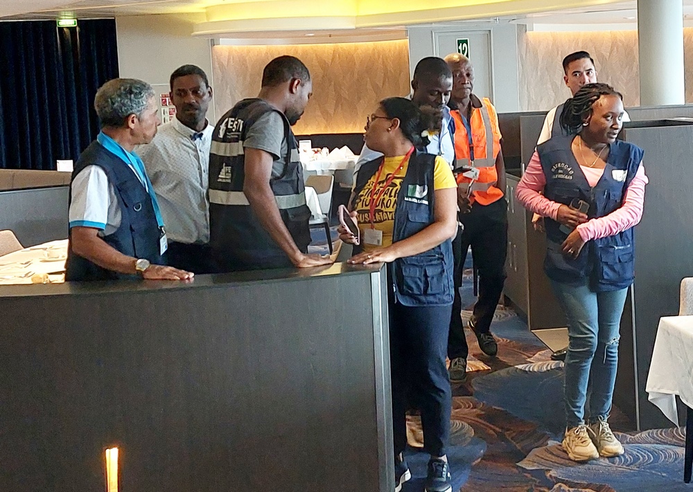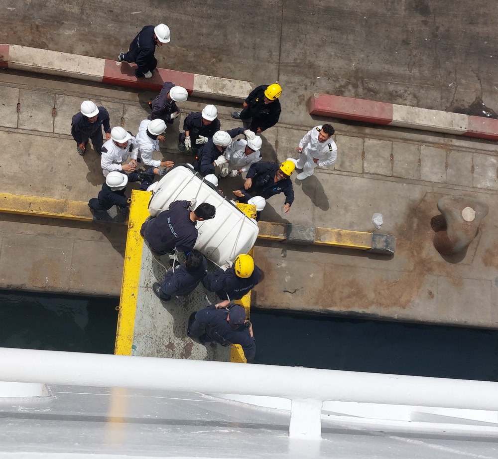 Der erste Teil der Rettungsübung bestand darin, dass ein Team im Inneren des Schiffs eine Bombe suchen sollte. Wie diese Suchaktion ausging, kann ich nicht sagen, aber das Resultat war, dass der Kapitän das Kommando zum Verlassen des Schiffs gab.