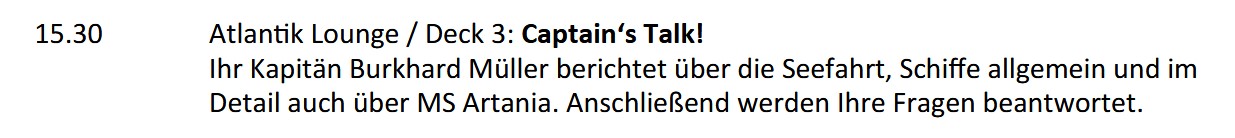 Reiseleiter Philip Heggemann informiert immer per Durchsage zur Geschichte, Sehenswürdigkeiten und Wissenswertes zu einem Ziel, kurz bevor wir dort einlaufen. Dies geschieht meist zu Zeiten, wo gerade in den Restaurants gefrühstückt wird. Zwar sind die Durchsagen informativ und interessant und die Art der Vortragsweise kann mit einem Radiosprecher locker mithalten, aber dennoch fühlten sich einige Gäste während des Frühstücks dadurch gestört und haben sich beschwert. Also wurde beschlossen und verkündet, diese Durchsagen nicht mehr in die Restaurants durchzustellen.