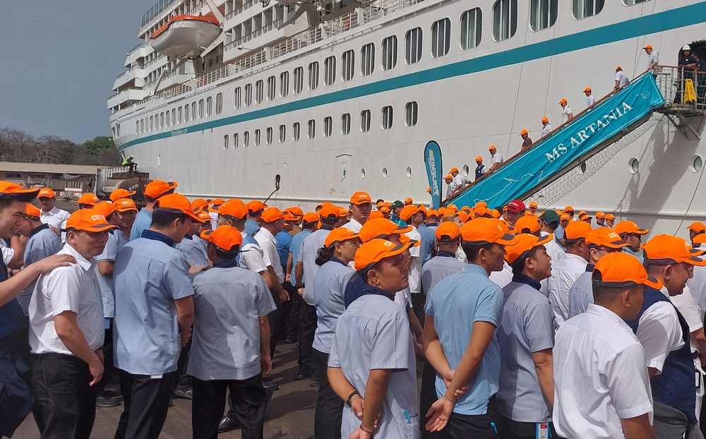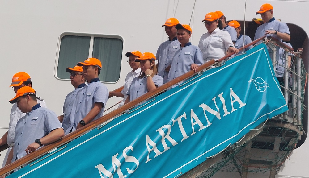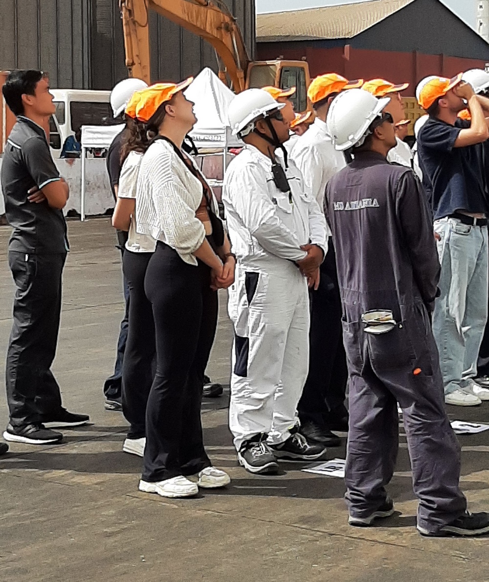 Als wir uns langsam für den Landgang fertig machten (Sonnenschutz, Rucksack packen etc.) erfolgte eine Durchsage, dass die für heute 10:00 Uhr angesetzte Rettungsübung für die Crew derart ablaufen soll, dass dabei sämtliche 500 Crewmitglieder das Schiff verlassen werden.