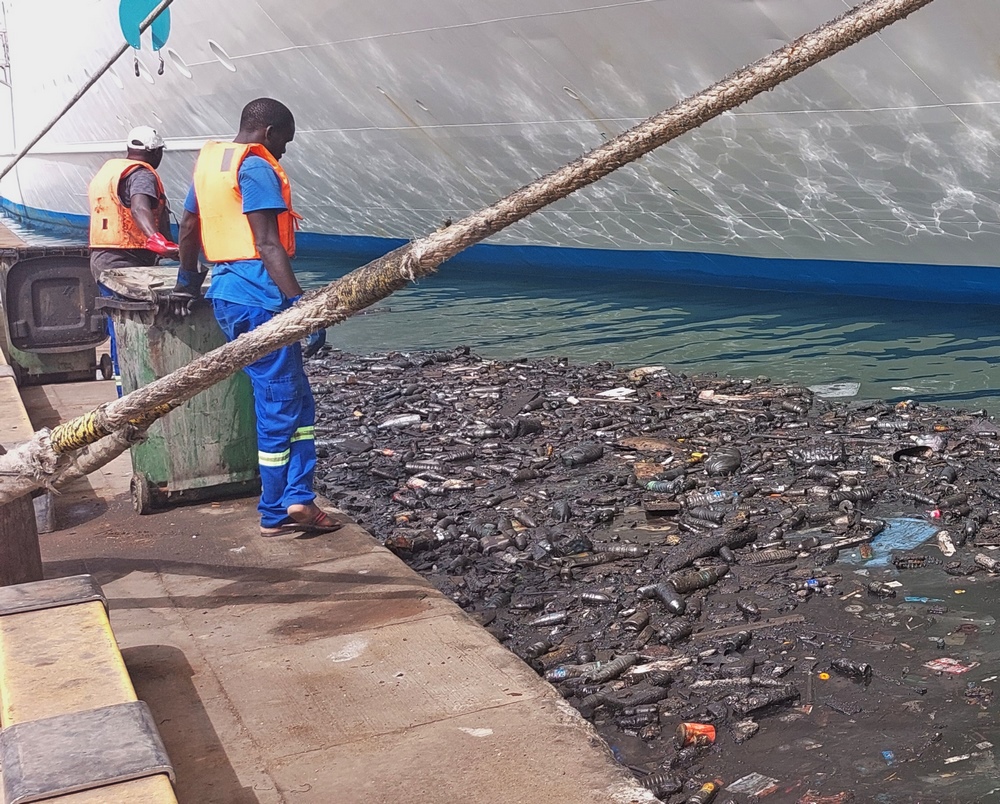 Als wir uns auf der Pier schon mal positionierten, sahen wir, dass an unserer Anlegestelle ein großer Teppich aus ölverschmierten Plastikmüll trieb.