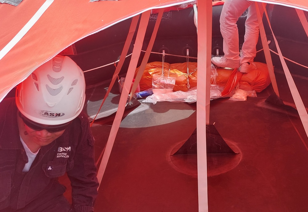 Nachdem die Rettungsinsel am Boden angekommen war, mussten sämtliche Crewmitglieder auf der einen Seite in die Insel hineinklettern und auf der anderen Seite wieder hinaus.