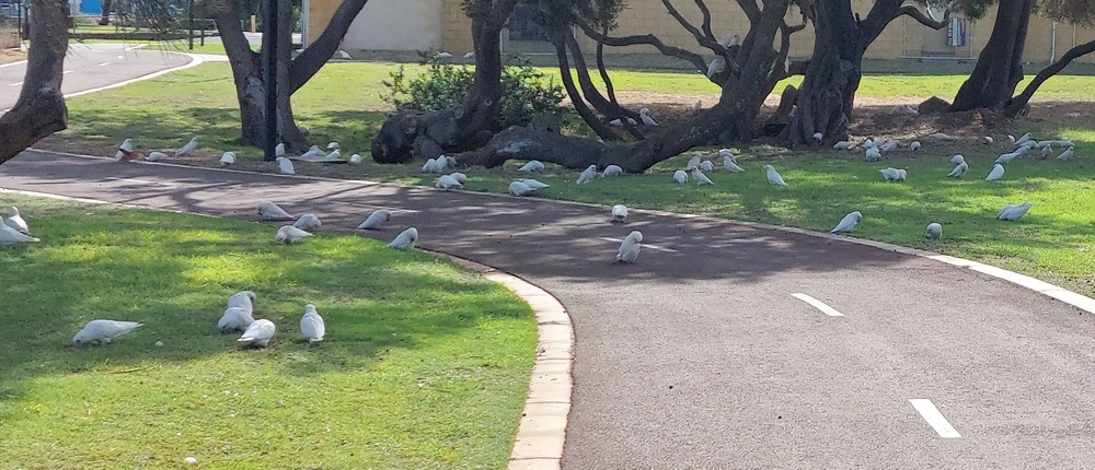 Diesem Umstand verdankten wir der Begegnung mit hunderten von weißen Kakadus, die die Wiesen und Bäume in einem Park bevölkerten.