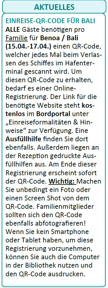 Dieser Hinweis im heutigen Tagesprogramm zur Zollerklärung für Bali verursachte bei etlichen Passagieren eine gewisse Aufregung, da doch etwas Knowhow im Umgang mit Smartphone oder Computer vorausgesetzt wird.