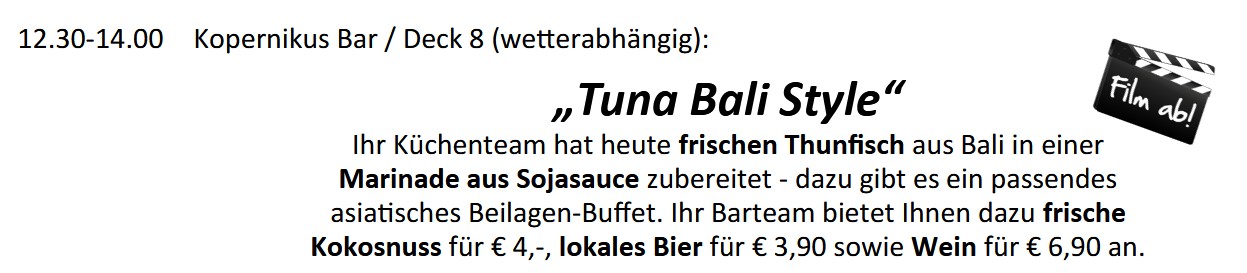 Am ersten Seetag eines neuen Reiseabschnitts wird in der Regel der Maritime Frühschoppen zelebriert. Diese Regel wurde heute gebrochen, vielleicht deswegen, weil parallel zum Mittagessen in der Kopernikus Bar Thunfisch gegrillt wurde.